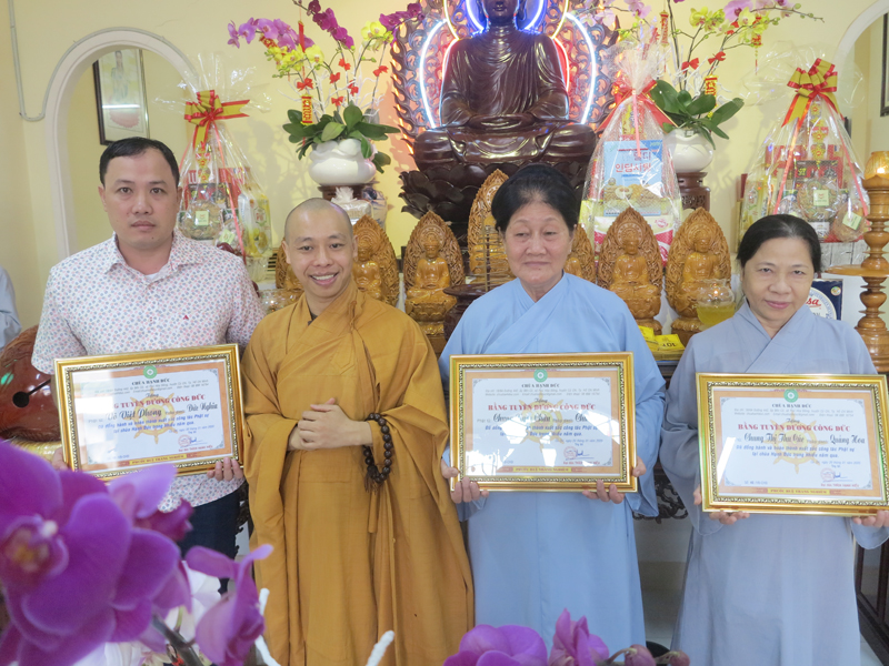 Để ghi nhận công đức của chư vị nam nữ Phật với sự đóng góp trí lực và tài lực đã hoàn thành tốt công tác Phật sự tại chùa Hạnh Đức, Đại đức Thích Hạnh Hiếu đã thay mặt bổn tự trao tặng bằng tuyên dương công đức đến 4 cá nhân và 3 tập thể.