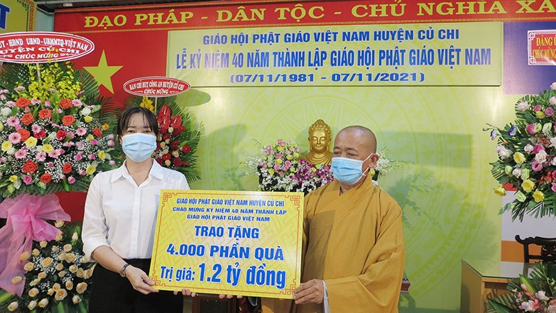trao bảng tượng trưng 4000 phần quà do chư tôn đức Tăng Ni huyện nhà đóng góp