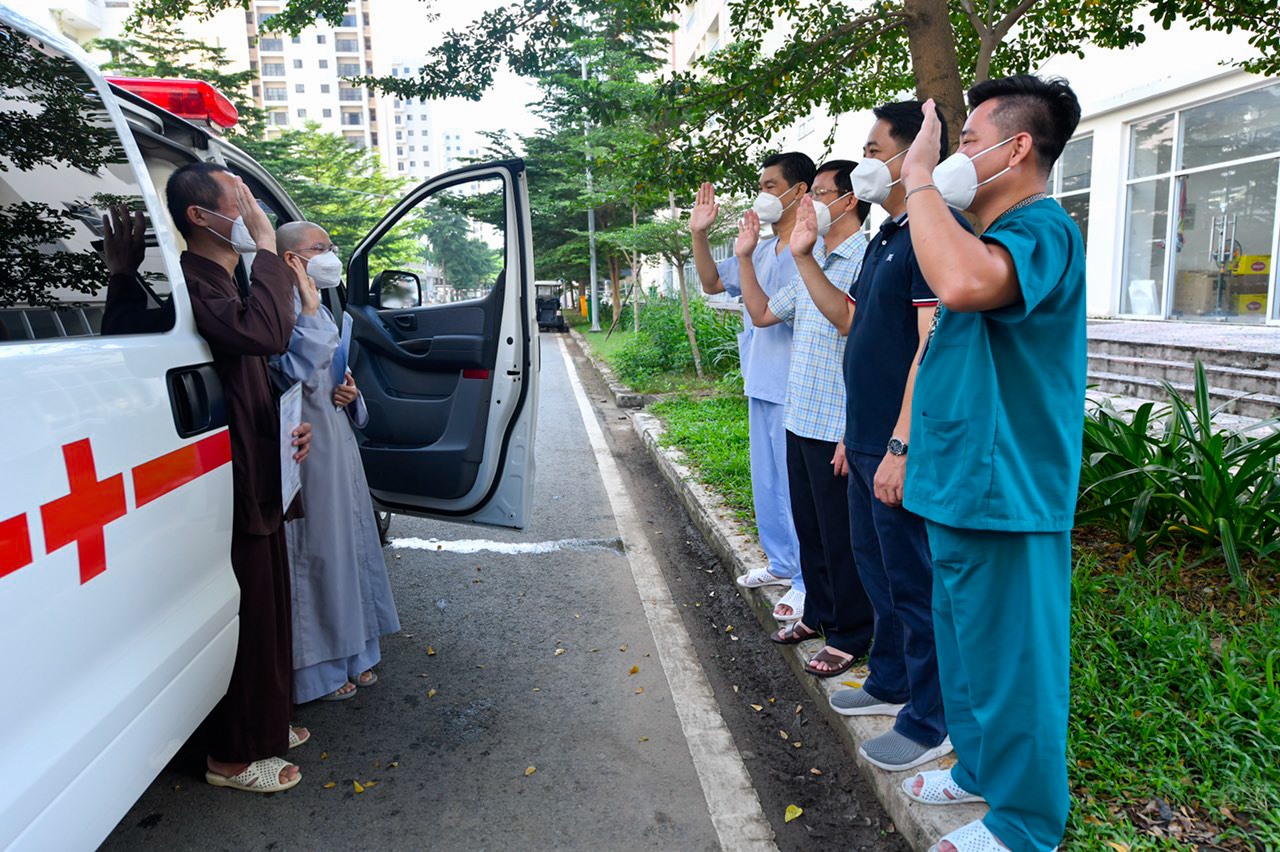 Tiễn đoàn tình nguyện viên Phật giáo, có BSCKII. Phạm Đăng Trọng Tường, Phó Giám đốc Bệnh viện Da liễu TP.HCM, Giám đốc Bệnh viện Dã chiến số 12; BS. Lưu Ngọc Đông - Phó Giám đốc Bệnh viện Dã chiến số 12.