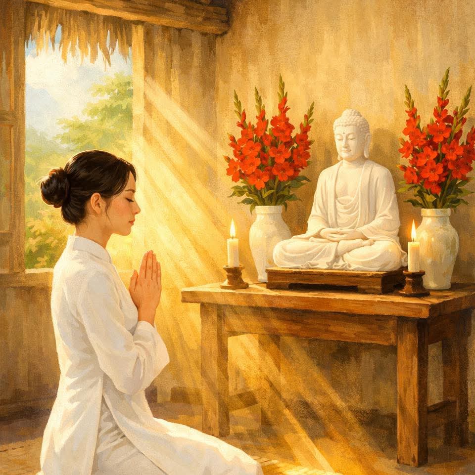 Kính lạy mười phương Phật, vô lượng kiếp luân hồi, đắng cay và mỏi mệt. Nay con dâng lời nguyện, quyết dứt trừ nghiệp xưa, không gây thêm oan trái.