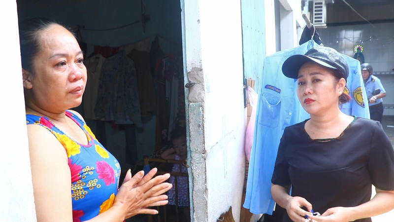 Chị Xuân (trái) vui mừng đến bật khóc khi được chị Dương (phải) thông báo miễn phí 2 tháng tiền phòng trọ. Ảnh: LÊ ÁNH