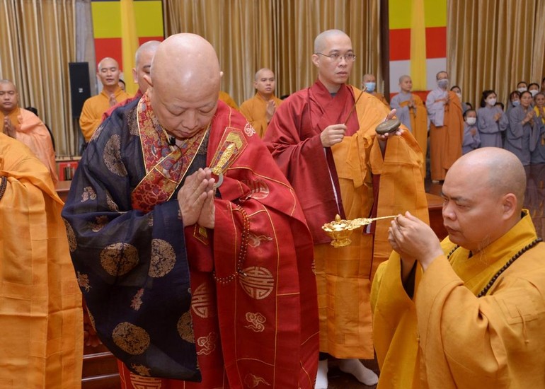 Chiều 20-8 (23-7-Nhâm Dần), ngày thứ ba của Đại lễ tưởng niệm, kỳ siêu đồng bào tử vong, cán bộ, chiến sĩ hy sinh trong đại dịch Covid-19, Hòa thượng Thích Lệ Trang, Trưởng ban Trị sự GHPGVN TP.HCM làm gia trì sư chẩn tế âm linh cô hồn theo nghi thức Đại khoa Du-già