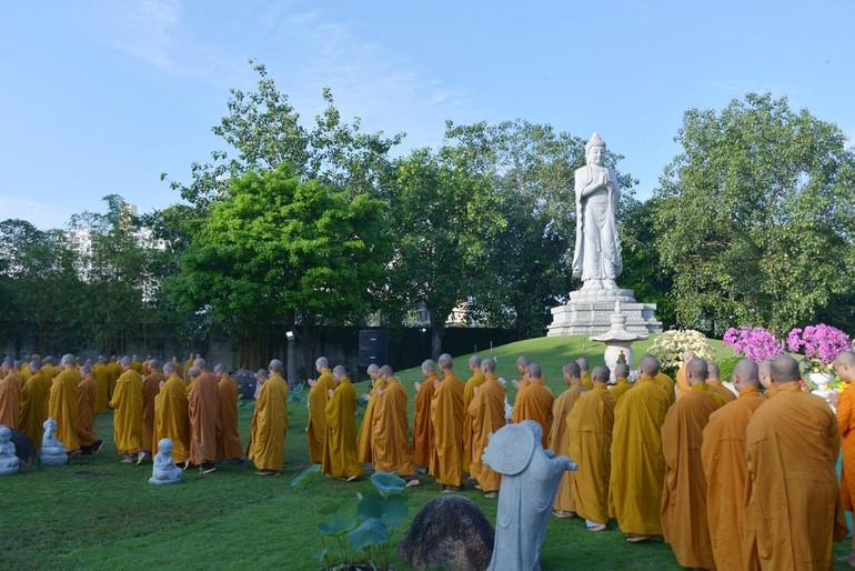 Nhân dịp này, hơn 1.000 Tăng Ni sinh viên Học viện Phật giáo VN tại TP.HCM đã trở về chùa Huê Nghiêm đảnh lễ Trưởng lão Hòa thượng Thích Trí Quảng, Đệ tứ Pháp chủ GHPGVN, Viện trưởng Học viện.