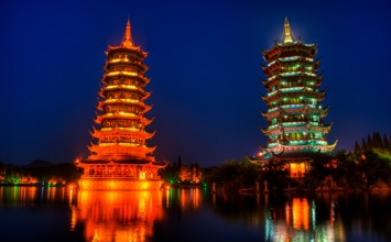 Nằm bên hồ Banyu, chùa Mặt trời và Mặt trăng là một trong những điểm tham quan nổi tiếng nhất của tỉnh Quế Lâm. Trong 2 ngôi thì chùa Mặt trời cao hơn, đồng thời cũng là ngôi chùa bằng đồng cao nhất thế giới với chiều cao 41 m. Chùa Mặt trăng gần đấy chỉ cao 35 m. Hai ngôi chùa này được kết nối với nhau bằng một đường hầm ở dưới lòng hồ. Thời gian tốt nhất để đến tham quan chùa Mặt trời và Mặt trăng bên hồ Banyu là vào ban đêm, khi cả hai đều được thắp sáng lên bằng sắc màu vàng và xanh dương.
