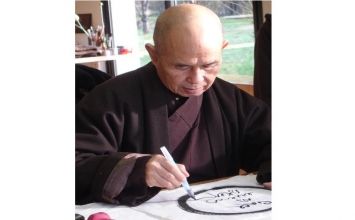 Giờ đây tôi có cơ hội đóng lại những con dấu, mỗi con dấu hôm nay ở Nội viện mang theo bao niềm vui, bao hạnh phúc. Và tôi biết trong mỗi tấm thư pháp ấy Thầy đã gói lại rất nhiều ân tình cuộc sống để gửi tặng cho đời. Nếu nhìn kỹ bạn sẽ thấy những tán lá xanh ve vẫy, những tiếng chim, tiếng gió, tiếng suối róc rách và nắng hạ. Bởi Thầy đã khai sinh ra những đứa con này trong cái thanh bình của một nơi bình yên như thế, với nhiều tình thương như thế. Đĩa mực đã hết, Thầy lại ung dung nhỏ vào mấy giọt nước và khẽ nói: “Nếu có mấy giọt trà thì thơm hơn”. Tôi tủm tỉm cười và mang lại cho Thầy một cốc trà rồi thưa: “Dạ liệu mọi người có biết trong này có hương thơm của trà không, thưa Thầy?” Thầy cười và nói: “Họ không biết nhưng mà mình biết và chưa chắc họ đã biết trong này còn có hơi thở nữa...” Tôi đỡ tấm thư pháp từ tay Thầy, bàn tay tiếp nối bàn tay sẽ đưa những tấm thư pháp này về muôn hướng. Mầu nhiệm thay một mảnh giấy nhỏ có thể chứa biết bao ân tình cuộc sống của Thầy và Tăng thân. Cầm một tấm thư pháp “Uống trà đi”, tôi lại thấy hình ảnh Thầy ung dung hớp từng ngụm trà nhỏ và nói “Uống trà đi các sư con” mà tôi vẫn thường nghe. Tin rằng khi bạn thấy dòng chữ này, bạn cũng sẽ nghe giọng nói thân quen của Thầy vọng về nơi từng con chữ. Xếp lại chồng thư pháp, con dấu nhỏ mỉm miệng cười tươi như hoa ban sớm để chào tạm biệt tôi. Tôi cười đáp lại. Ngày mai những con dấu sẽ cười tươi với bạn và bạn nhớ cười lại cho tươi bạn nhé! Bởi mỗi nẻo về của niềm vui sẽ tiếp nối đường đi cho những niềm vui mới. Một ngày mới đang bắt đầu bạn có nhận ra không?