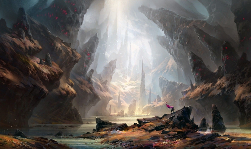 Cầm theo một con dao găm, hiệp sĩ bám vào sợi dây và từ từ chui xuống hang. Nhìn quanh, chàng thấy vài bộ xương của những người đi trước, ai cũng cầm vũ khí trong tay nhưng thật khó xác định tại sao họ lại chết.